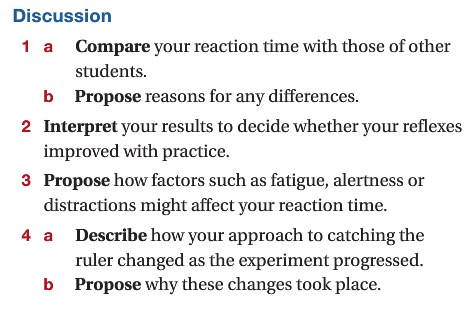 Use your data table to record the results in this spreadsheet. Calculate the average reaction time. Save the spreadsheet in your H: or USB stick. Send the completed spreadsheet to your teacher.